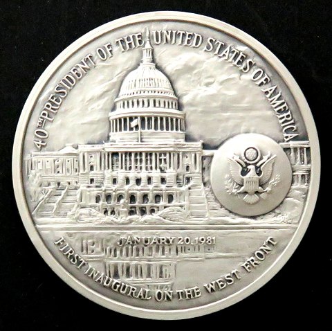 US Præsident Ronald Reagan medalje af finsølv. Avers med portræt af præsidenten, revers Det Hvide Hus med indsættelsesdatoen 20. januar 1981 *40th president of the United States og America* og *First Inaugural og the West Front* nummereret European edition. Diameter 63 mm., vægt ca. 133,5 gr. finsølv (.999)