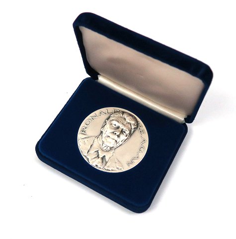 US Præsident Ronald Reagan medalje af finsølv. Avers med portræt af præsidenten, revers Det Hvide Hus med indsættelsesdatoen 20. januar 1981 *40th president of the United States og America* og *First Inaugural og the West Front* nummereret European edition. Diameter 63 mm., vægt ca. 133,5 gr. finsølv (.999)