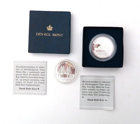 Sølvmedaljer udgivet i forbindelse med broindvielser. Storebæltsmedalje 1998 af finsølv, udformet af billedhuggeren Trine Maria Høy i samarbejde med gravør Huch Hvidtfeldt. Den Kgl. Mønt har fremstillet stemplerne, og præget medaljen. Diameter 38 mm. Finsølvindhold: 1 ounce. Med garantibevis og æske fra Den Kgl. Mønt. Øresundmedalje 2000 af finsølv, udformet af billedhuggeren Trine Maria Høy. Den Kgl. Mønt har fremstillet stemplerne, og præget medaljen. Diameter 38 mm. Finsølvindhold: 1 ounce. Med plexiglaskapsel samt garantibevis og pose fra Den Kgl. Mønt.