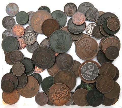 Realisation af samling. 13 stk. 5 øre 1874 – 1921, inkl. bl.a. 1898 og 1904. 33 stk. 2 øre 1874 – 1921, inkl. bl.a. 1919 jern og 1919 bronze. 42 stk. 1 øre 1874 – 1923, inkl. bl.a. 1880 og 1920.