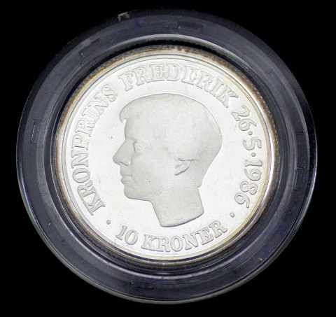 10 kr. 1986 sølv med riflet rand. Mønten er designet af tegneren Johan Alkjær i anledning af Kronprins Frederiks 18 års fødseldag. Portrætterne er udført af billedhuggeren Hanne Varming.
