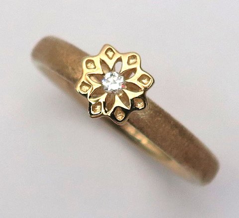 Ring af 8 kt. guld, prydet med facetsleben, klar sten i rosetfatning. Ring Str. 55, samlet vægt ca. 2 gr.