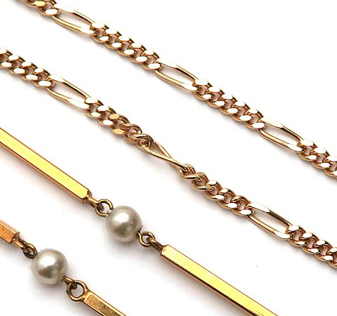 To halskæder af gulddoublé. Kæde med kunstperler L. 39 cm. Kæde med delvist pansermøstrede led L. 66 cm.