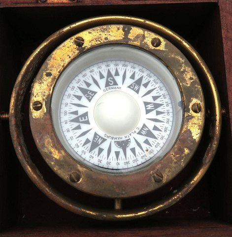 Tysk C. Plath Hamburg skibskompas i nyere kasse af træ med messingbeslag. Kompasset stammer formodentlig fra en ophugnings plads for skibe ude i Østen, og blev monteret i en ikke tilhørende trækasse.
