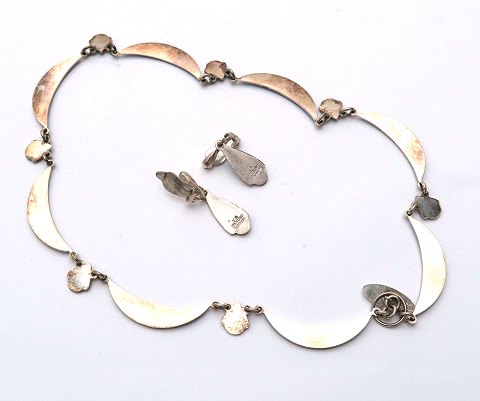 Smykkesæt bestående af halskæde med segmentled og bidsellås samt to øreclips. Halskæde L. 38 cm., øreclips L. 20 mm.