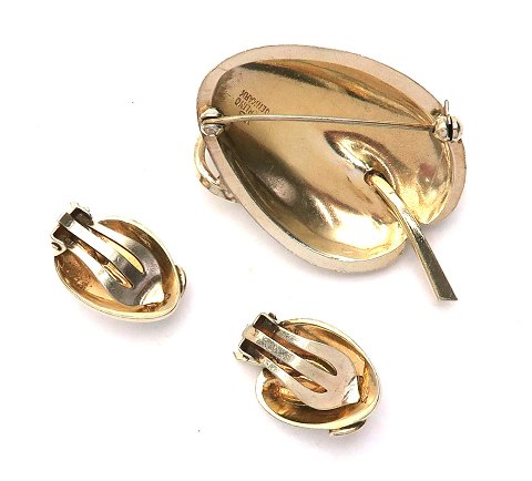 Smykkesæt af vifteformet emaljebelagt, forgyldt sterling sølv bestående af broche og par øreclips. Design Volmer Bahners - Farum omkring 1960.