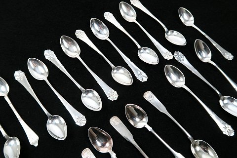 Lot bestående af seks antik rococo kaffeskeer, 12 fransk lilje kaffeskeer, 6 musling kaffeskeer, 2 fransk lilje marmeladeskeer, samt 1 marmeladeske og 1 kaffeske samt 1 fransk lilje théske. Samlet vægt ca. 320 gr.