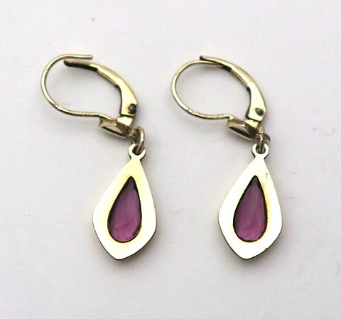 Par ametyst ørestikker af gulddoublé, hver prydet med dråbeformet, facetsleben ametyst. L. 28 mm.