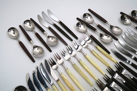 Bestik med skæfte af oliebehandlet teaktræ eller kunststof, bestående af 12 middagsskeer, 12 middagsgafler, 12 middagsknive og 12 kaffeskeer, alle med skæfte af teaktræ. 7 gafler, 5 knive og 1 ske med kunsttstof skæfte.