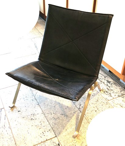Poul Kjærholm PK-22 hvilestol med stel af matbørstet stål, sæde og ryg af sort læde. Ryg H. 71 cm., udført hos Fritz Hansen.