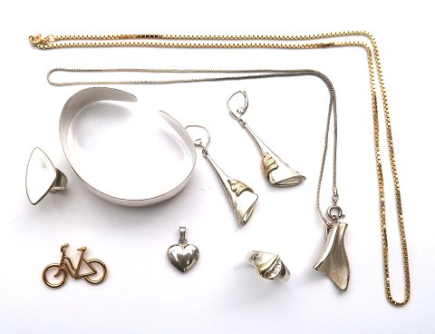 Lot bestående af armring af sterling sølv, Georg Jensen vedhæng i form af cykel af forgyldt metal, par ørelokker af delvist forgyldt sterling sølv, hjerte vedhæng af sterling sølv, halskæde med vedhæng af sterling sølv, kæde L. 42cm., 2 ringe af sterling sølv, Str. 54 og 58 samt venezia halskæde af forgyldt sterling sølv, L. 58 cm.