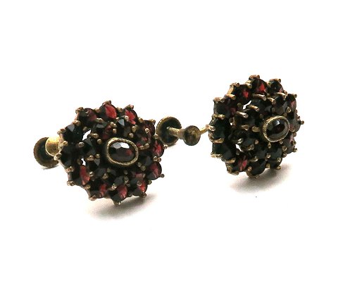 Granat smykkesæt bestående af forgyldt armring med forhøjet front, prydet med granatroset, skinne ligeledes prydet med granater hele vejen rund, samt par øreskruer af forgyldt sølv, prydet med forhøjet granatroset.