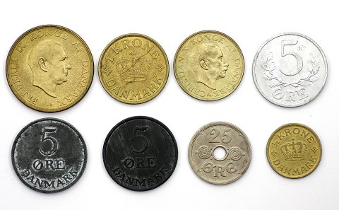 Lot bestående af 5 øre 1941, 1956 og 1958, 25 øre 1947, ½ krone 1940, 1 kr. 1940 og 1947 samt 2 kr. 1952.
