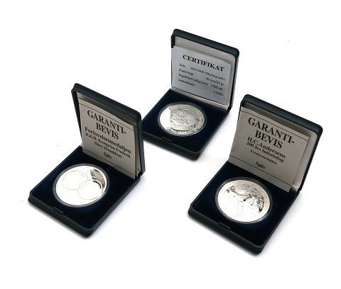 Panimex medaljer af sterling sølv, præget i anledning af Kronprinsen og Mary Donaldsens forlovelse i 2003, revers operahuset i Sydney, eventyrmedaljen i anledning af H.C. Andersens 200 års fødselsdag samt medalje udgivet i samme anledning, revers henholdsvis H.C. Andersens hus og potpourri af hans eventyr. Alle i originale etuier og med certifikater. Hver medalje vejer 24 gram.