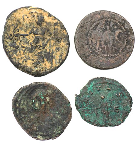 Lot bestående af 2 romerske mønter, borgerkrigsmønt tilskrevet, samt arabisk mønt fra antikken.
