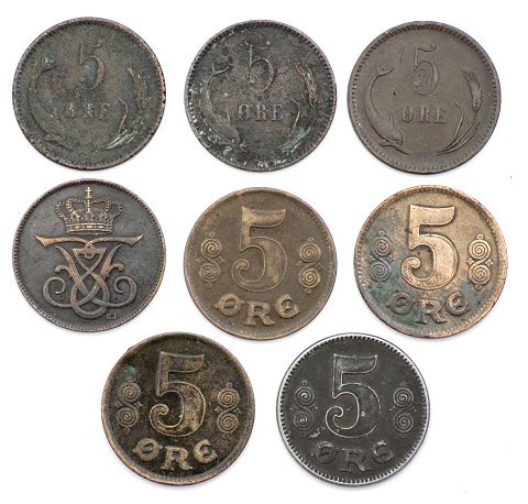 Christian IX, Frederik VIII, Cristian X, 5 øre 1874 ~ 1921 (8)