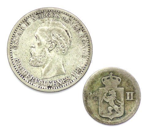 Norge, 10 øre / 3 skilling 1875 sølv og 50 øre 1901 sølv (2)
