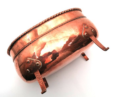 Gammel, oval jardiniere af kobber på fire ben, dekoreret med perlebort og gradueret kant. 34 x 24 cm., H. 18 cm. Ustemplet. 20. århundrede.