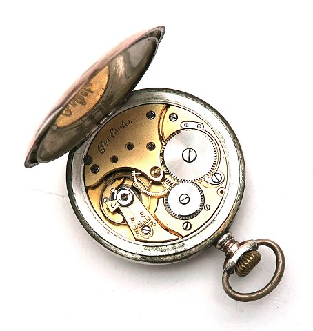 Perfecta lommeur af sølv med emaljeskive, 12/24 timer arabertal og separat sekundviser. Urkasse diameter 52 mm.