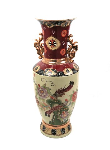 Kinesisk dekorationsvase, håndbemalet med motiver i form af fantasi paradisfugle, blomster og ornamentik. H. 60,5 cm.
