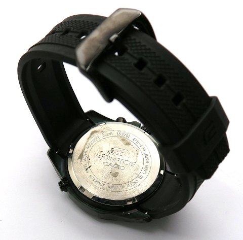 Casio Edifice herrearmbåndsur, ref. nr. 5378 i urkasse af sort tonet stål. Sort skive med stregindikation, central og separat sekundviser, separat 24-timer visning. Quartsværk. Urkasse diameter 44 mm. Gummirem med metalspænde.