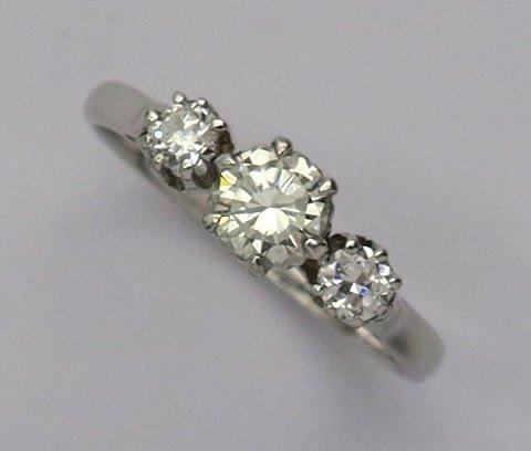 Ring af 18 kt. hvidguld, prydet med brillantsleben diamant på ca. 0,35 ct. GIA farve P, flankeret af 2 brillantslebne diamanter på tilsammen 0,20 ct. Ring Str. 54½, samlet vægt ca. 3,5 gr.