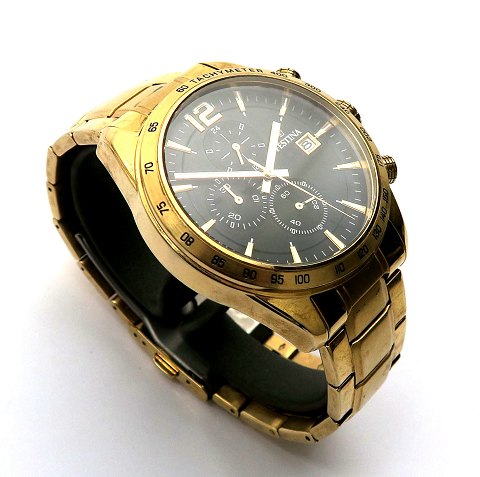 Festina Tachymeter chronograph herrearmbåndsur, ref. nr. F20266 i urkasse og med foldelænke af guldtonet stål. Tachymeter lynette, sort skive bag mineralglas med stregindikation, central og separat sekundviser, datovisning i #3 position, tachymeter og chronograph funktion. Quartzværk. Urkasse diameter 43 mm.