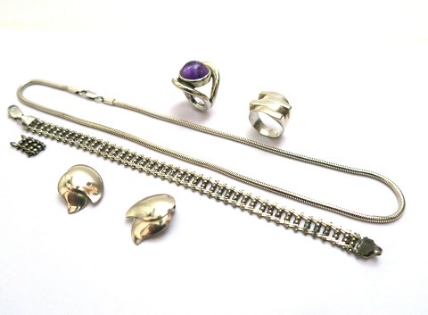 ot diverse smykker af sterling sølv, bestående af halskæde, L. 42 cm., armlænke med ekstra led, L 19/20,5 cm., par bladformede øreclips, Ring med cabochnsleben ametyst, Str. 50 og ring med bred front, Str. 53.