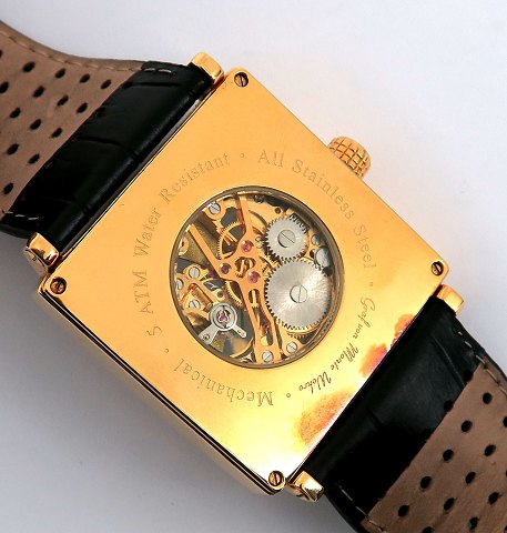 Graf von Monte Wehro herrearmbåndsur i rektangulær urkasse af forgyldt stål. Sort, med malteserkors prydet skive med værkindsigt for og bag med romertal og central sekundviser. Optræksværk, urkasse 44 x 44 mm. Læderrem med metalspænde.