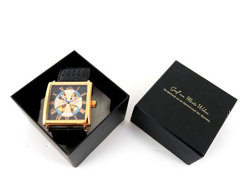 Graf von Monte Wehro herrearmbåndsur i rektangulær urkasse af forgyldt stål. Sort, med malteserkors prydet skive med værkindsigt for og bag med romertal og central sekundviser. Optræksværk, urkasse 44 x 44 mm. Læderrem med metalspænde.