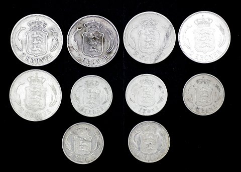 Christian IX / Christian X, 1 kr. og 2 kr. 1875 ~ 1916 sølv (10)