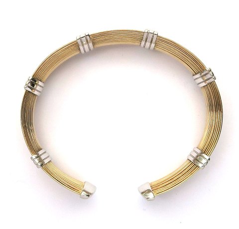 Åben armring af 14 kt. guld og hvidguld bestående af konkav trådbånd af guld, fattet med hvidguldsegmenter, vægt ca. 27 gr.