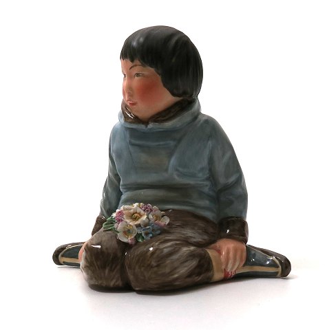 Royal Copenhagen figur #12419 i form af siddende Grønlænderpige med blomsterbuket på skødet. H. 10 cm., 1. sortering. Modellør: Carl Martin-Hansen (1877-1941)