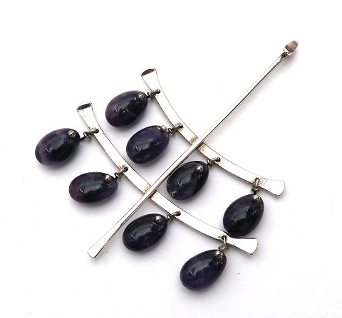 Georg Jensen, Vivianna Torun vedhæng af sterling sølv, dessin 135, prydet med otte dråbeformede, delvis marmorerede ametyster. L. 9,5 cm.