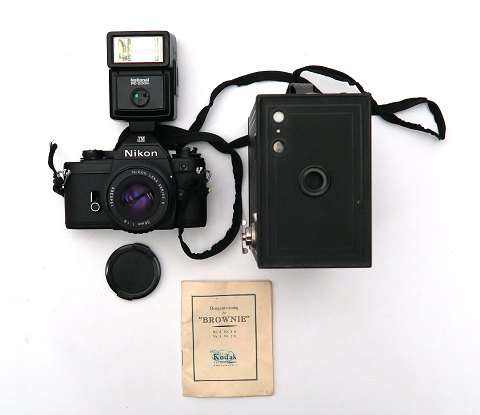 Lot bestående af Nikon EM spejlrefleks analog kamara med 50 mm. 1:1,6 optik og National PE-2006 ekstern blitz samt Kodak Brownie box kamera nr. 2a med salgsmærkat fra Illums København inkl. dansk brugsvejledning. Fotima beredskabstaske til Nikon kameraet medfølger.