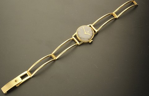 Med sort skive med stregindex, Ø 2 cm, med leddelt lænke af guld 14 kt. længde 17,5 cm