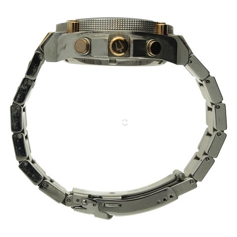 Urkasse med leddelt rem og foldelås i rustfrit stål. Urkasse Ø 45 mm, sortmønstret skive med hvid stregindeks, visere af stål. Dato kl. 4. Vandtæt til 300 m. Safirglas. Bon og originalkasse med manual medfølger.