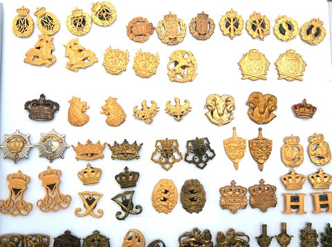 Lot bestående af diverse Dronning Margrethe og Frederik IX emblemer, emblemer fra den Kgl. Livgarde med mere. Alle monteret med magneter og lagt på opslagstavle.