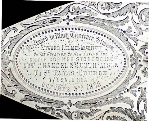 Engelsk murerske af sterling sølv fra 1865, brugt ved grundlæggelsen af kancelliet og midtergangen under udvidelsen af St. Pauls kirken, Balsall Heath, Birmingham. Skeblad rigt dekoreret med volutter og akantusblade og dedikationsindskrift (oversat): Gave til Mary Taverner Simeox fra arkitekt Edward Holmes under anledning af lægningen af hjørnesten til kirkens udvidelse af kancelliet og den sydlige midtergang ved St. Pauls kirke, Balsall Heath, Birmingham, den 3. oktober 1865.