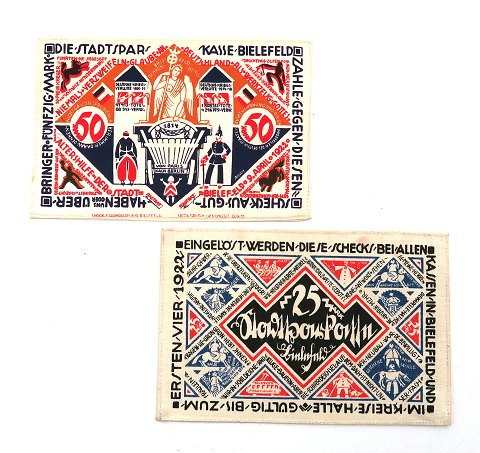 Tyskland, Stadtsparkasse Bielefeld, 25 Mark og 50 Mark stofpenge ucirkuleret, med tryk på begge sider. Trykt hos E. Gundlach i 1921, 12 x 8 cm Henholdsvis *Zur 700-Jährigen Jubiläumsfeier der Stadt Bielefeld am 15. Juli 1921* og *Altershilfe Bielefeld 9. april 1922*