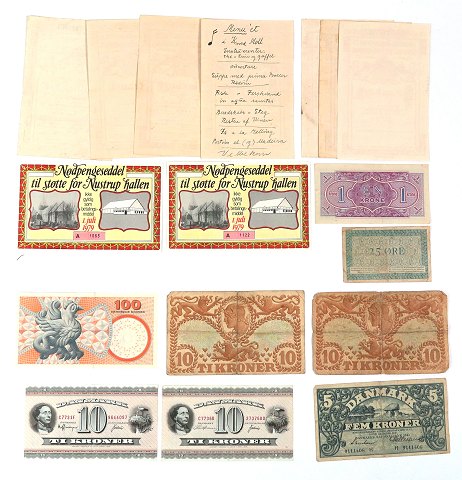 Danmark 5 kr. 1942 H. 2 x 10 kr. 1939 O. 2 x 10 kr. 1977 C. 100 kr. 2002 B0. 1 kr. UDSTEDT AF DEN ALLIEREDE OVERKOMMANDO TIL BRUG I DANMARK (1945). 25 øre DEN DANSKE BRIGADE (1947 – 1958). 2 x 10 kr. ”nødpengeseddel” til støtte for Nustrup hallen 1979. 7 stk. svinekort 1940.