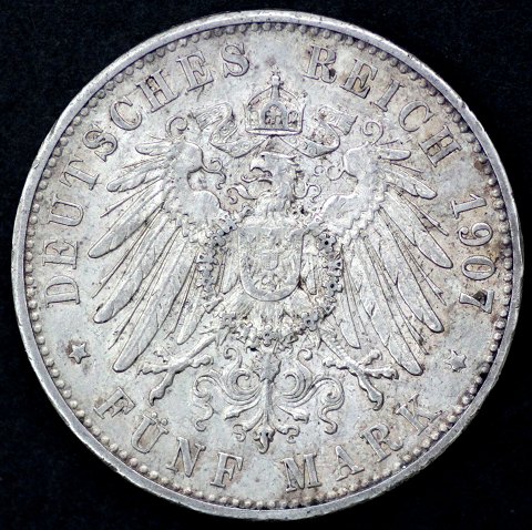 Tyskland, Wilhelm II, Würthemberg, 5 Mark 1907F sølv - KM# 632