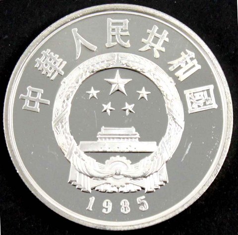 Kina, 5 Yuan 1985 sølv (.900), 22.22 gr. Diameter 36 mm.