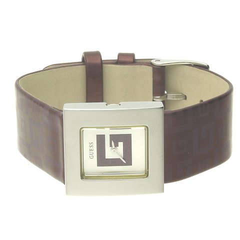 Guess dame armbåndsur, urkasse af stål 25x25 mm, stålskive med Bordeux glimmer G i midten. Bordeux blank læderrem med stållås. Original futeral medfølger.