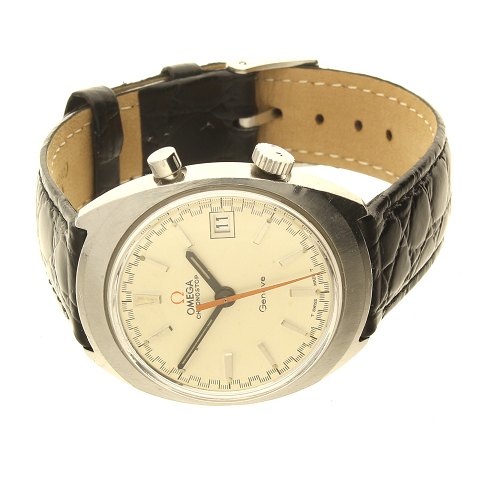 Omega Chronostop herrearmbåndsur, Geneve. Urkasse 34x40 mm, cremefarvet skive med stregindex, dato kl. 3. Plexiglas. Testet vandtæt til 30 m. Sort krokodille/kalveskinds rem.