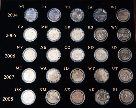 USA, Samlekasse med Quarter Dollars fra samtlige 50 Stater årstal 1999 ~ 2003. Mønterne er å 2 bakker, indordnet efter årstal og stat. Kasen måler 33 x 27 x 5 cm.