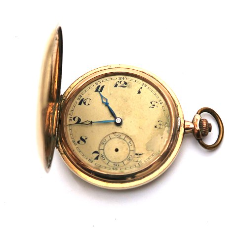 K-J herrelommeur af gulddoublé med defekt skive og manglende sekundviser, dog fungerer værket. Urkasse diameter 50 mm., front med monogram AJA.