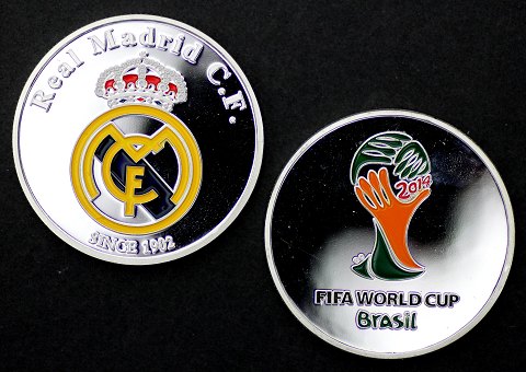 2 delvis farvelagte Medaljer af metal med henholdsvis Real Madrid Logo, revers Cristiano Ronaldo samt medalje af metal fra World Cup 2014 i Brasilien, revers portręt af Neymar jr. Diameter 40 mm.