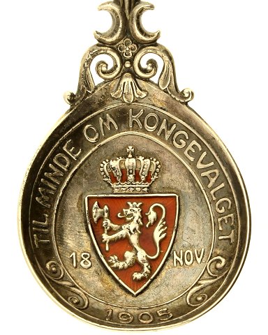 Tekst: Til minde om kongevalget 18. november 1905. Emaljebelagt våben på laffen og Haakon VII's monogram øverst - delvist med emalje.