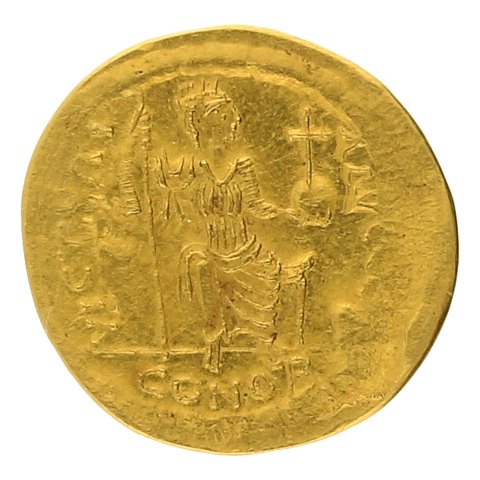Byzans, Justinian I, 527-565, Solidus,4,37 g. Konstantinopel. Hjelmklædt hoved med der holder globus og skjold